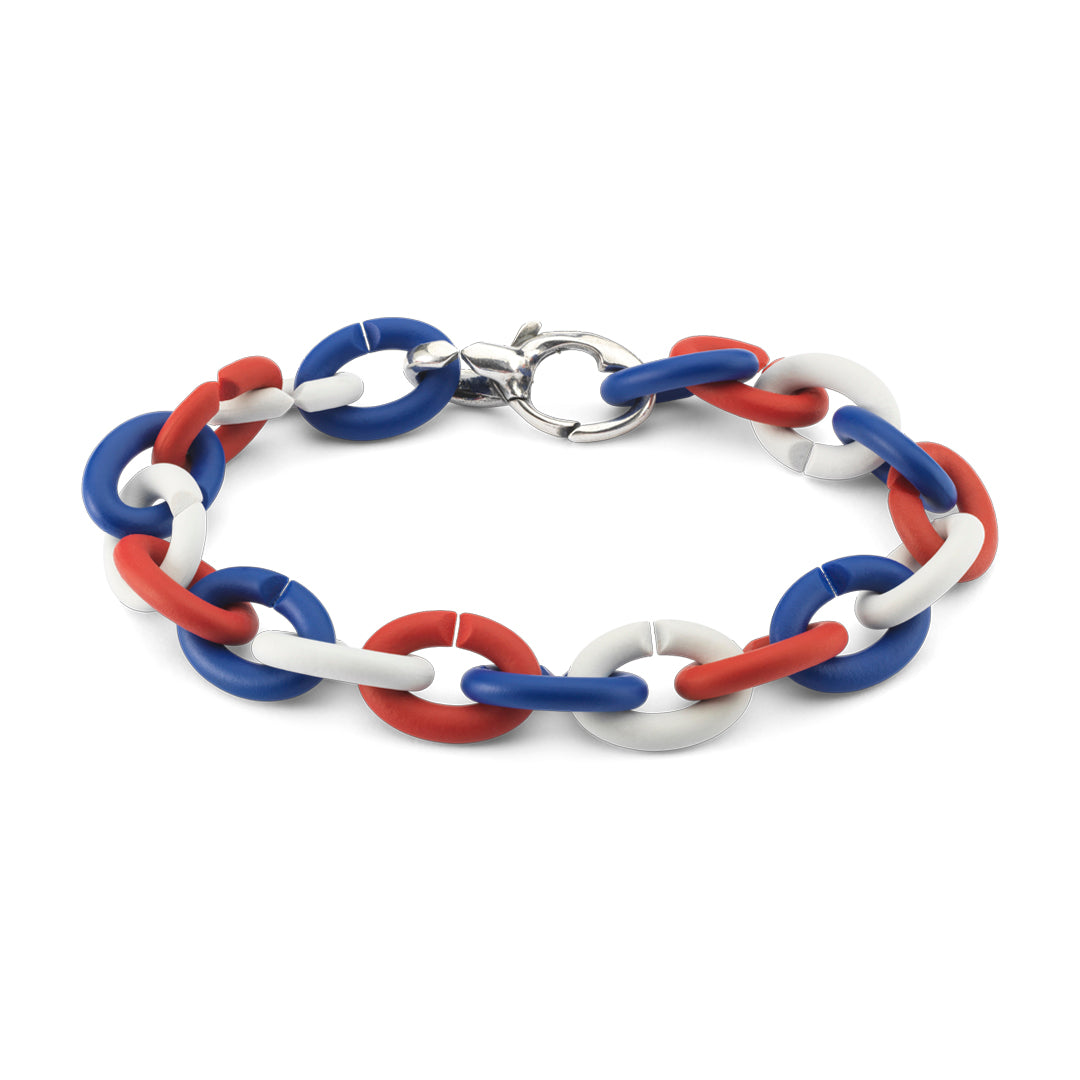 This beautiful bracelet consists of 7 Cobalt Blue, 6 Red, and Pale Grey Rubber X links combined with a Heart Within Silver Lock made of 100% sterling silver.