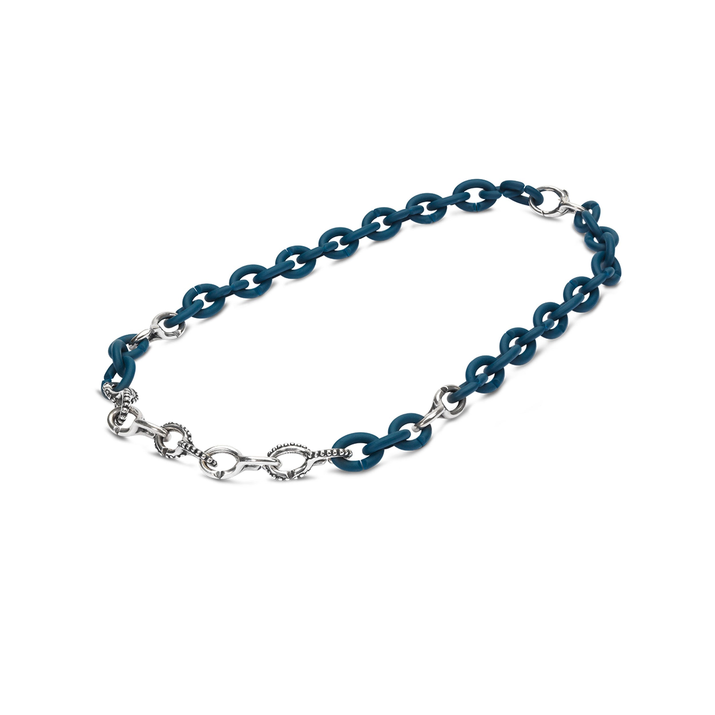 A necklace made from Deep Petrol Rubber X and silver links Milestones and Basic double.